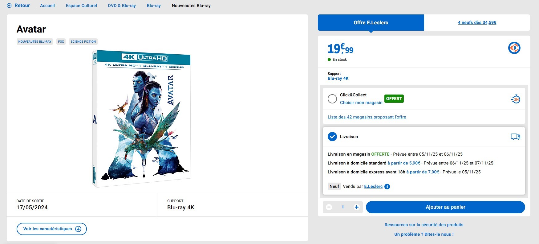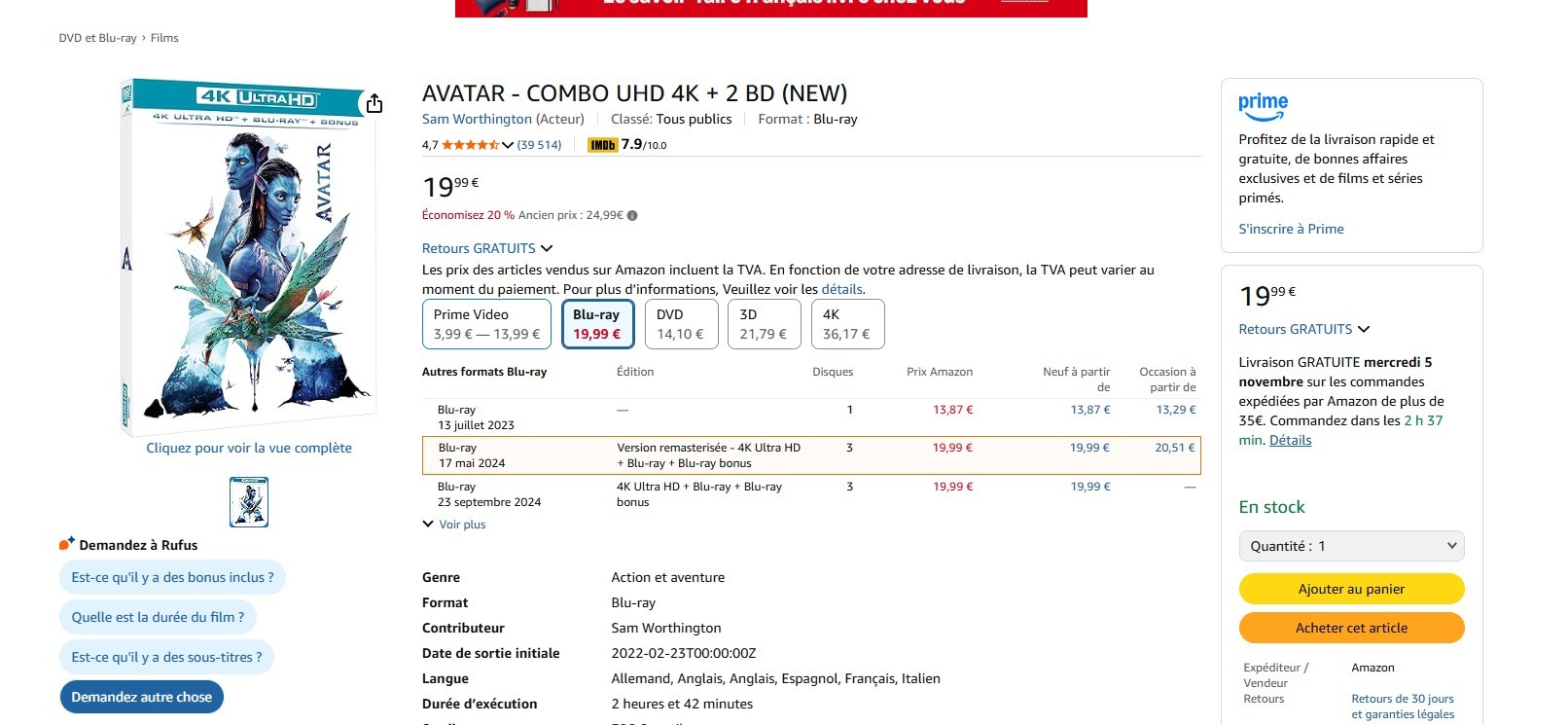 Sur Amazon il y a deux fiches pour le 4K d'Avatar, une à 25€ et une autre à 27.64€. bizarre non ?