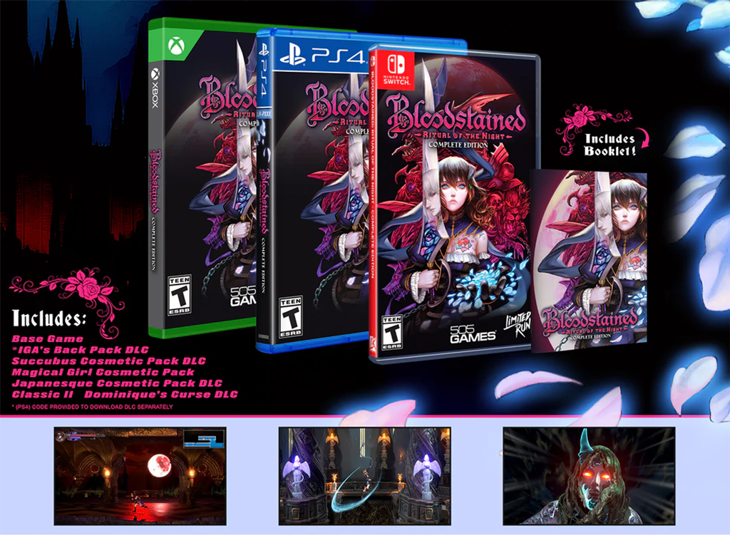 - L'édition complète du jeu Bloodstained: Ritual of the Night comprend : DLC « Sac à dos » d'IGA, DLC « Pack cosmétique Succube », Pack cosmétique « Fille magique », DLC « Pack cosmétique Japanesque », DLC « Classic II : La malédiction de Dominique »
