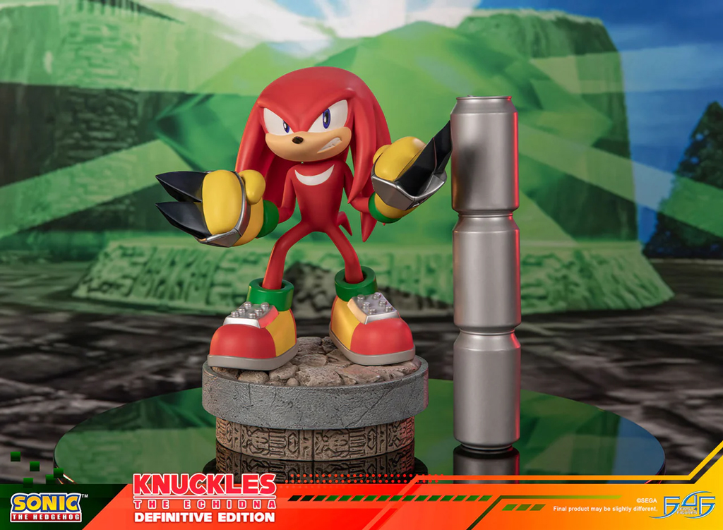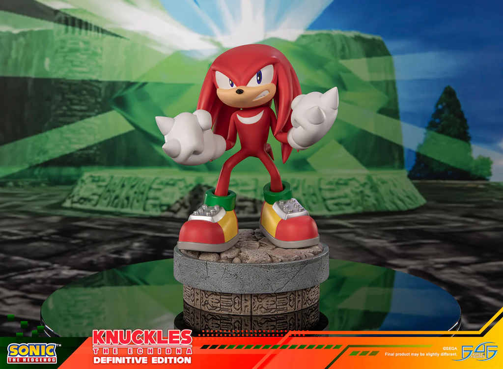 Description éditeur : First 4 Figures est fier de présenter sa dernière statue en résine, Sonic The Hedgehog - Knuckles ! Knuckles the Echidna est le gardien fort et déterminé de la Master Emerald, ainsi que l'un des plus anciens amis et rivaux de Sonic. Connu pour son attitude féroce et pragmatique, il est farouchement loyal, ne recule devant rien pour protéger son foyer et a un sens aigu du devoir. Cette statue représente Knuckles fidèlement recréé dans son apparence moderne du jeu vidéo. Knuckles se tient dans une posture large et puissante, les poings levés, mettant en valeur sa fourrure rouge emblématique, ses jointures hérissées, son expression féroce et ses longues épines. Le socle représente fidèlement l'emplacement de l'île Angel dans la série Sonic The Hedgehog. L'édition définitive est livrée avec une main droite interchangeable supplémentaire tenant un fragment de la Master Emerald, équipée de fonctions d'éclairage LED. Elle comprend également des mains gauche et droite interchangeables supplémentaires avec des gants de combat équipés de griffes en forme de pelles.