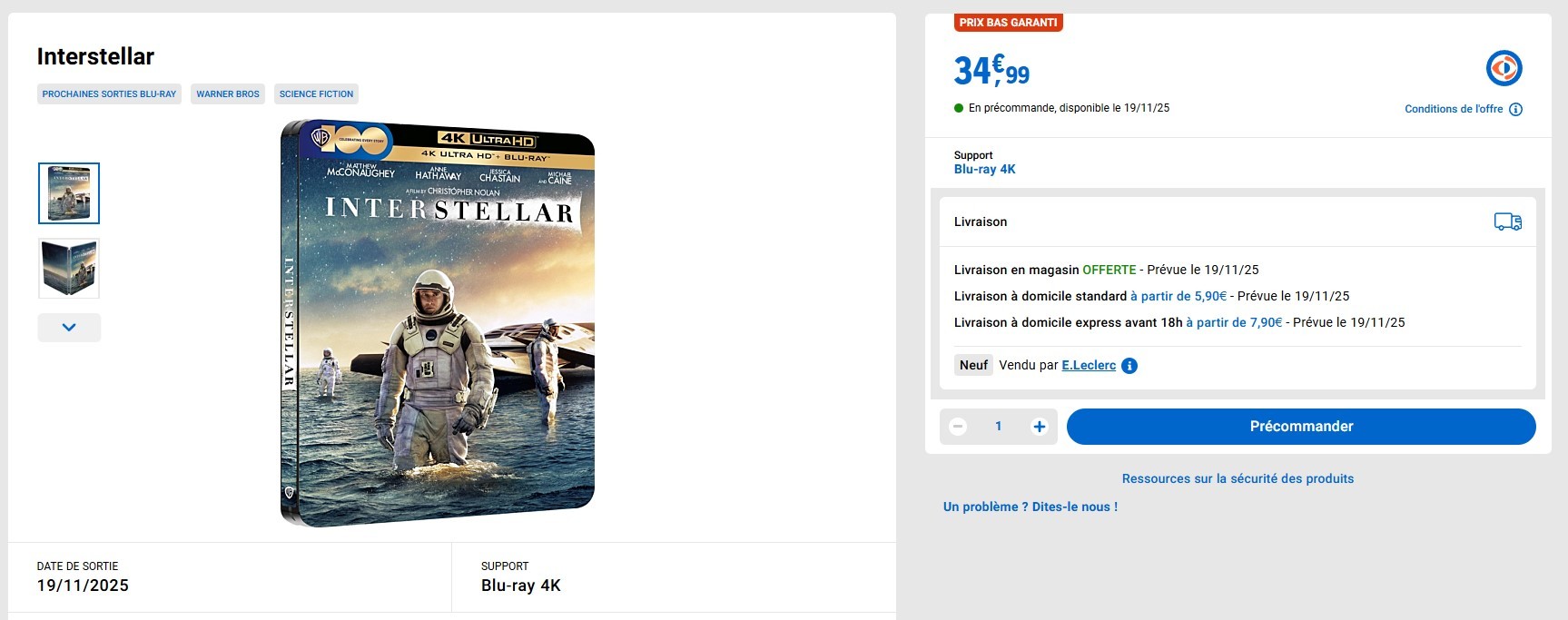 Le nouveau steelbook du film Interstellar en blu-ray 2D+4K est de retour en stock sur Leclerc