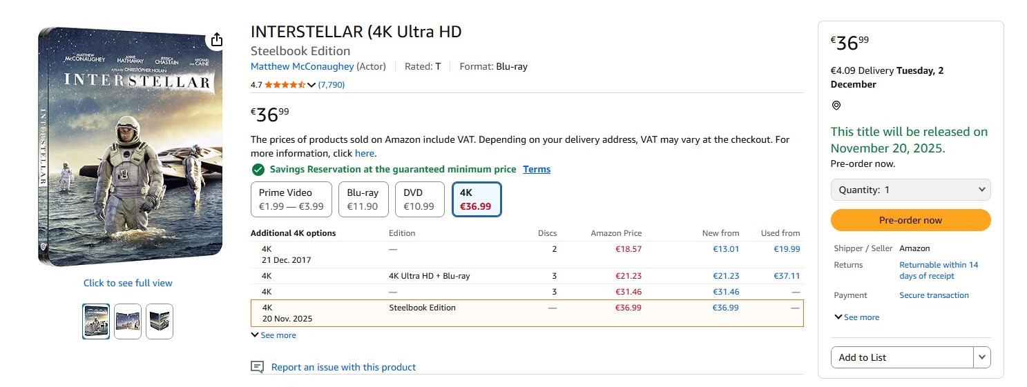 Steelbook dispo sur Amazon.it à 28€ + 4€ de frais de port en ce moment (-15€ de réduction si vous arrivez à accédez à l'offre de -15€ dès 30€ d'achat sur les articles vendu et expédié par amazon) sur le site