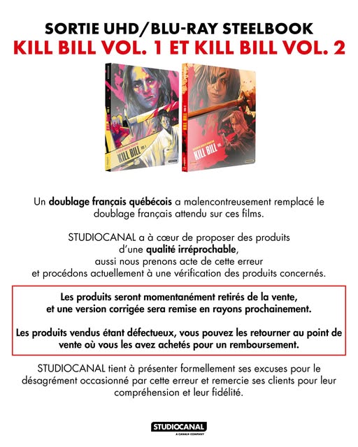 Studio Canal vient de réagir et publier un communiqué officiel sur leur page Facebook a propos des VFQ de Kill Bill vol.1&2