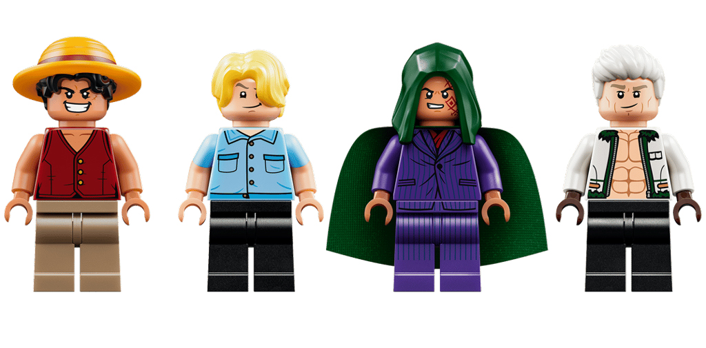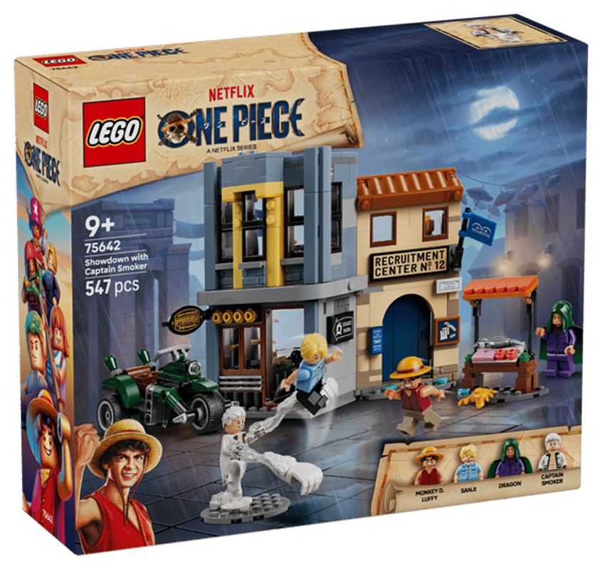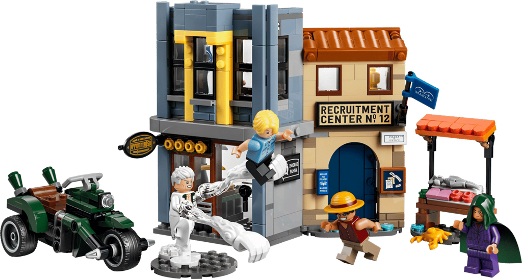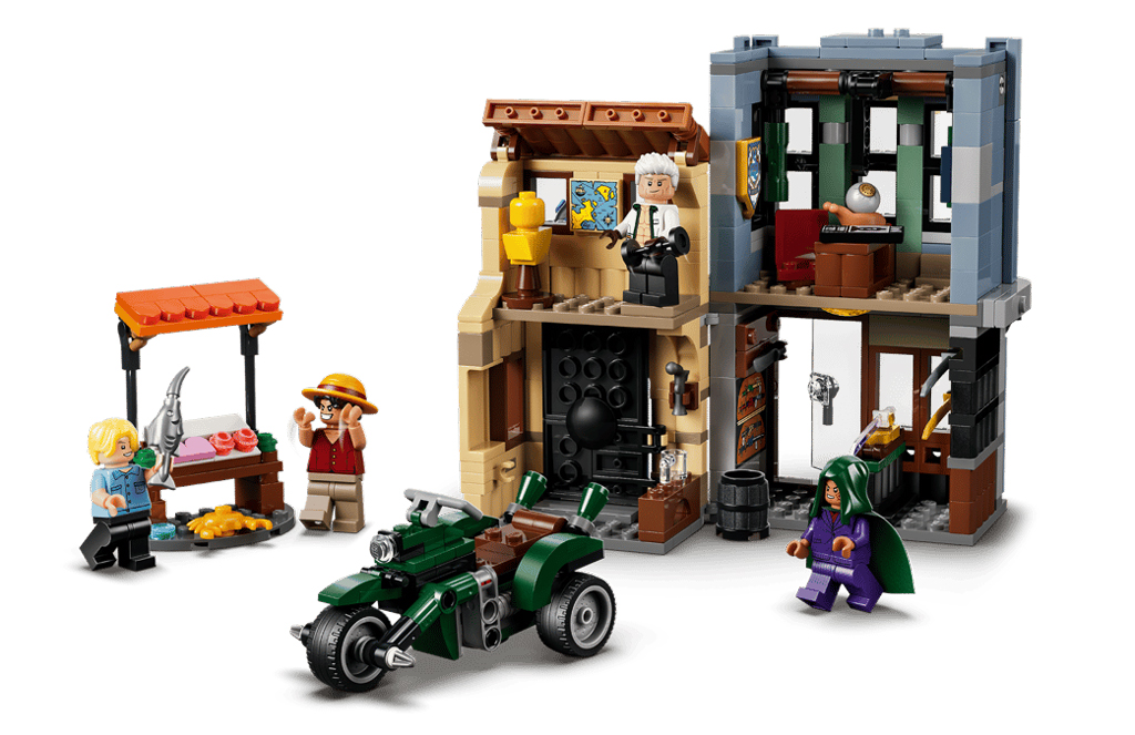– Cap vers l’aventure sur le marché animé, avec Monkey D. Luffy, Sanji, Dragon et le capitaine Smoker. Le set inclut un magasin de katanas, le centre de recrutement de la Marine et la puissante moto de Smoker