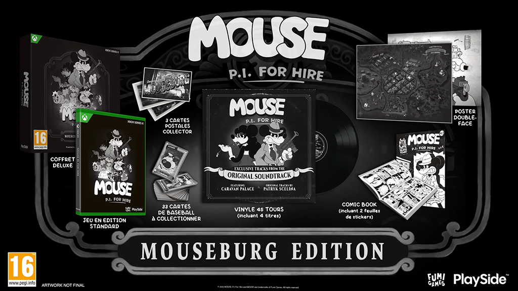 Description éditeur : MOUSE : P.I. For Hire est un jeu de tir à la première personne débordant d'action qui s'inspire des cartoons des années 30. Son animation rétro en noir et blanc est dessinée à la main, image par image, afin d'offrir une esthétique vintage saisissante. Naviguez entre les couches de corruption dans cette histoire de détective passionnante aux aspects de film noir, avec des environnements dynamiques à explorer, une bande originale jazz orchestrale ainsi qu'un arsenal bien chargé d'armes cartoon et de bonus destructeurs.