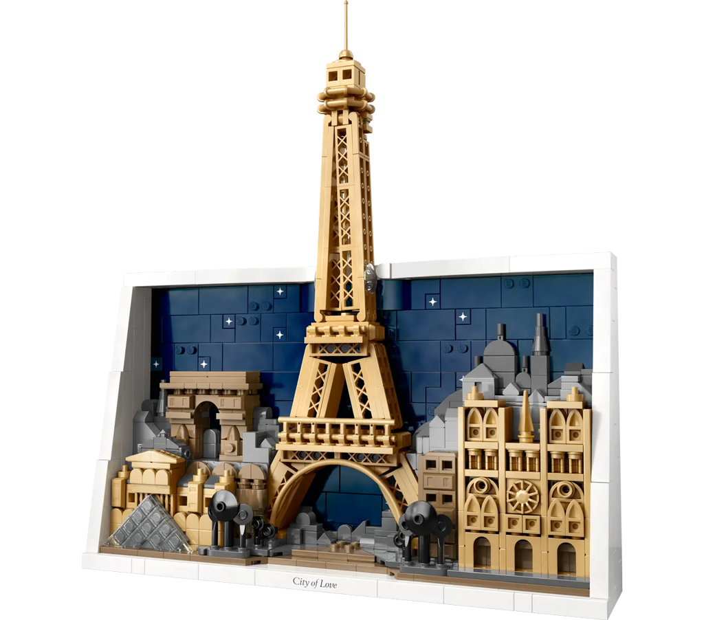 – Ce set de décoration d’intérieur LEGO détaillé Paris, ville de l’amour (21064) présente 4 icônes de l’architecture parisienne sur fond de silhouette urbaine et de ciel étoilé, rehaussés d’un cadre de briques branches