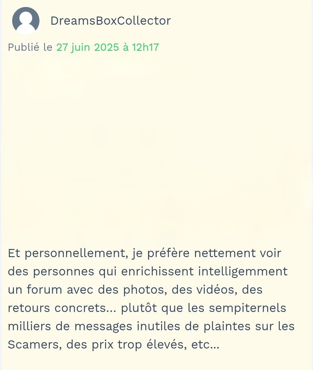 Je reprenais juste à mon compte ce que tu disais. Je préfère effectivement voir des messages qui enrichissent le blog plutôt que de lire les tiens qui sont, comme tu dis, de sempiternelles plaintes...