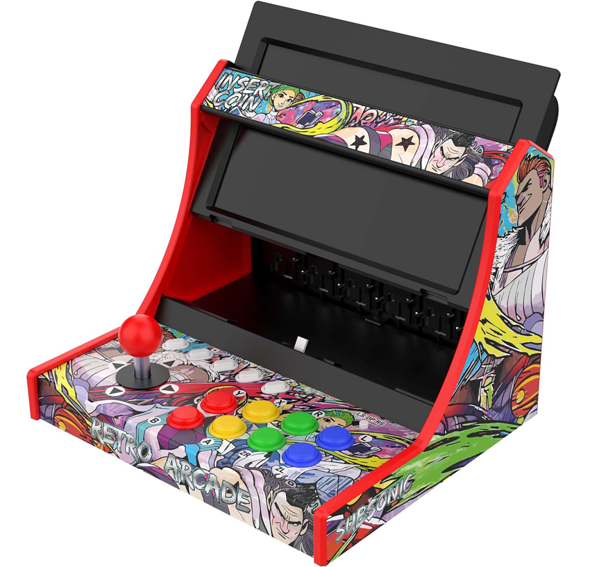 - BORNE D’ARCADE COMPATIBLE NINTENDO : permet de transformer une console Switch 2, Switch OLED ou Switch en une véritable mini-borne d’arcade ! Il suffit d’insérer la console Nintendo – non fournie – dans l’adaptateur qui se glisse dans la station d’accueil et se connecte directement via le port USB-C de celle-ci. Console Nintendo, accessoires et jeux non inclus