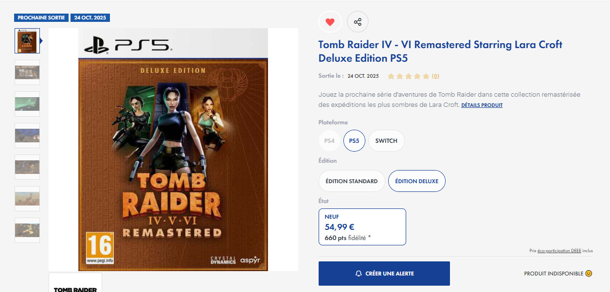 @shady77 Tomb Raider IV, V, VI remastered - édition Deluxe (PS5) est en rupture de stock chez Micromania