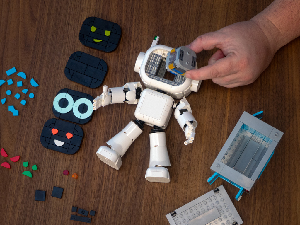 Description éditeur : Voici WALT, votre nouvel ami de bureau ! Composé de 654 briques, ce petit robot expressif mesure 21,2 cm. Il possède 17 points d'articulation : le cou, les épaules, les poignets, les doigts, les hanches et les chevilles sont mobiles, ce qui permet de lui faire prendre de nombreuses poses différentes. De plus, le modèle est fourni avec quatre visages interchangeables, ainsi qu'une large gamme de tuiles de différentes couleurs pour créer vos propres expressions faciales. Les possibilités sont quasi infinies ! Pour changer de visage, appuyez sur une tuile à l'arrière de la tête, ce qui révélera également le cerveau électronique de WALT. Il y a également à l'arrière un petit compartiment à piles contenant deux piles amovibles, et un conteneur de rangement, avec des portes ouvrantes et un couvercle, qui peut être utilisé pour ranger les pièces de façade supplémentaires lorsqu'elles ne sont pas utilisées.