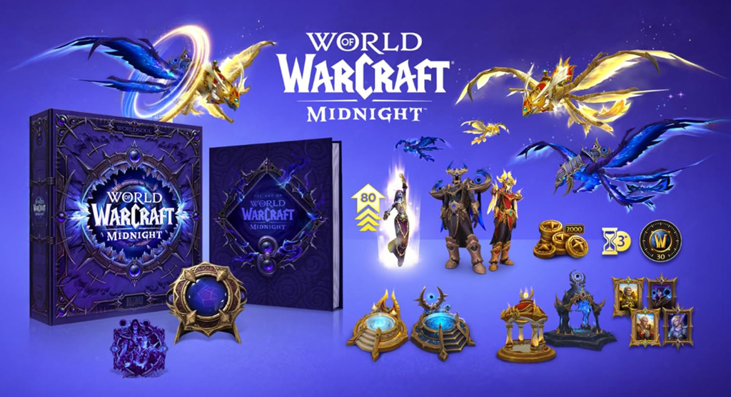 Contenu en jeu de l'édition Midnight Epic : objets d’ameublement, animaux de compagnie Hopeflutter et Doomfeathers, ensembles de transmogrification d’armure Lighstrider Raiment et Voidstrider Raiment, montures Voidlight Surger, Lightwing Dragonhawk et Voidwing Dragonhawk.